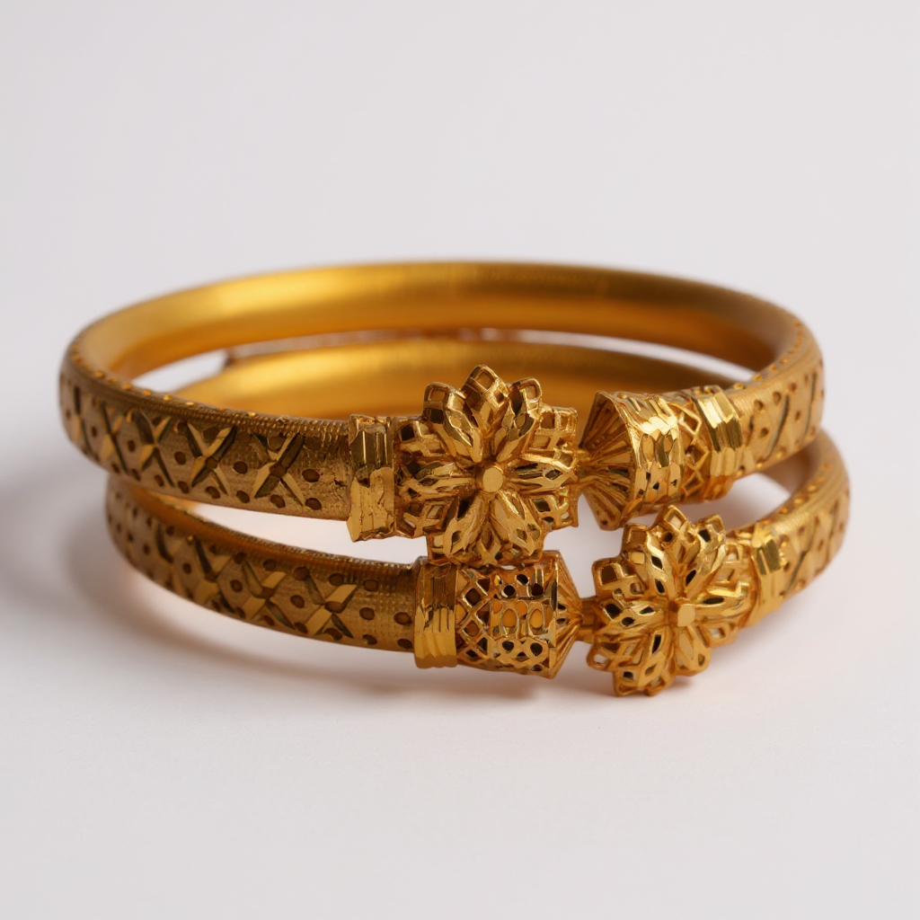 Stylish 2pc gold plated bangles with real gold-inspired shine and detailing. A perfect match for bridal wear, parties, and daily fashion.